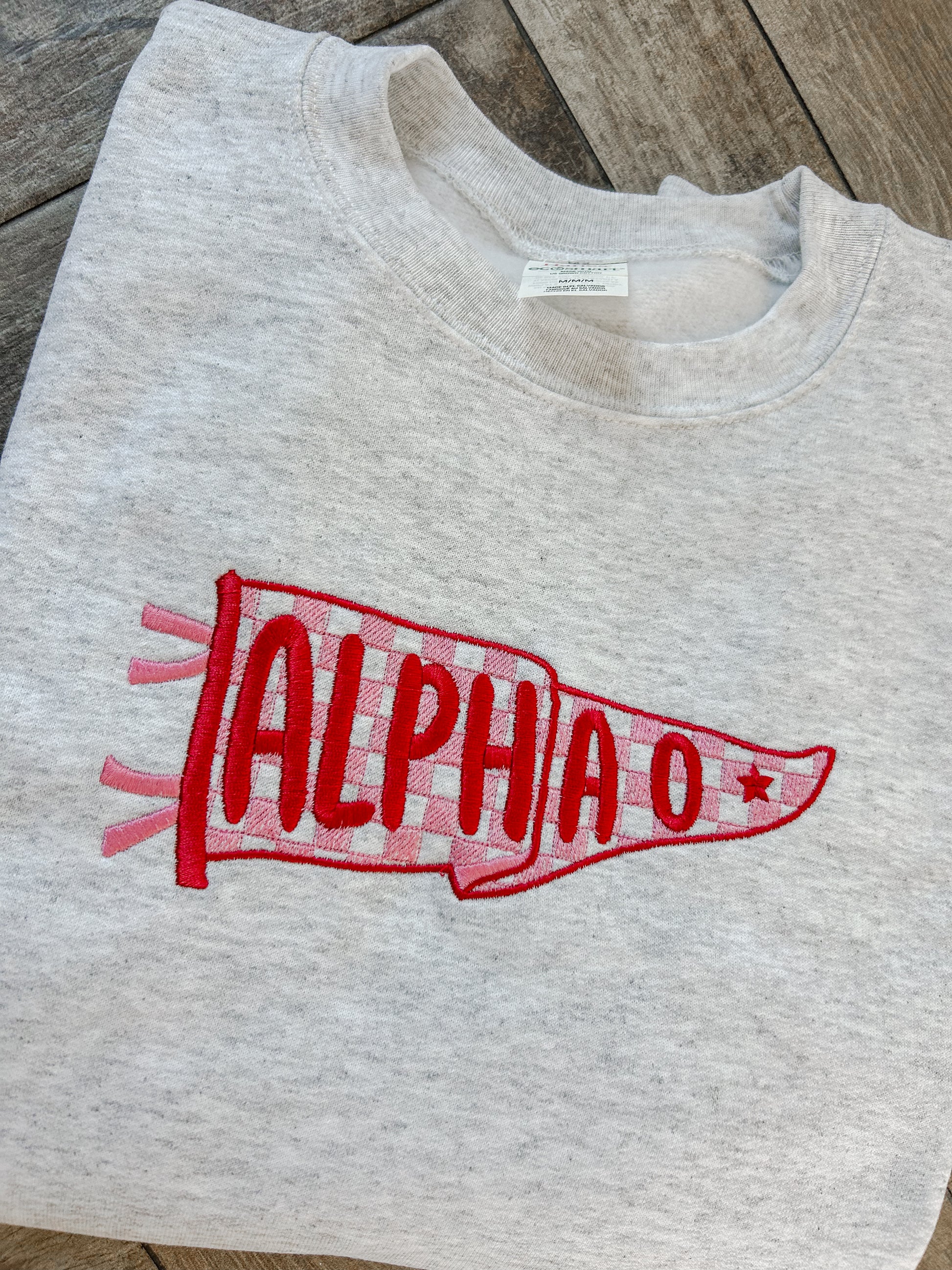 This embroidered Alpha Omicron sweatshirt features bold lettering set against a checkered background for a fun, eye-catching twist on a classic design. The layered stitching adds dimension and texture, making the details stand out beautifully. Made on a soft, relaxed-fit sweatshirt, it’s an easy go-to for everyday wear, campus events, and everything in between.