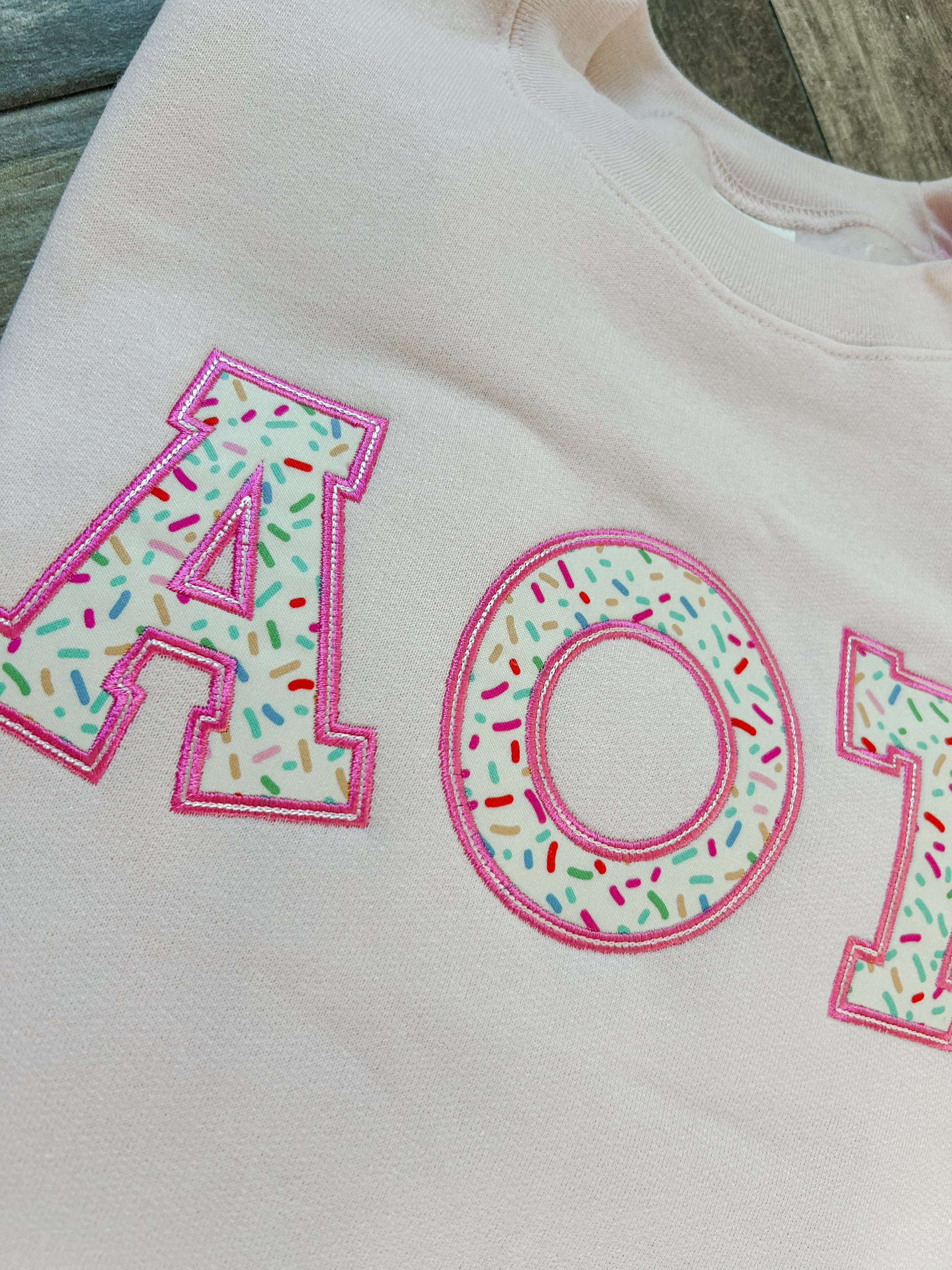 This light pink sweatshirt features an appliqué Alpha Omicron Pi design made from playful sprinkle-patterned fabric. The layered stitching adds texture and dimension, making the letters stand out beautifully. Crafted on a soft, relaxed-fit sweatshirt, it’s a cozy and stylish way to show sorority pride.