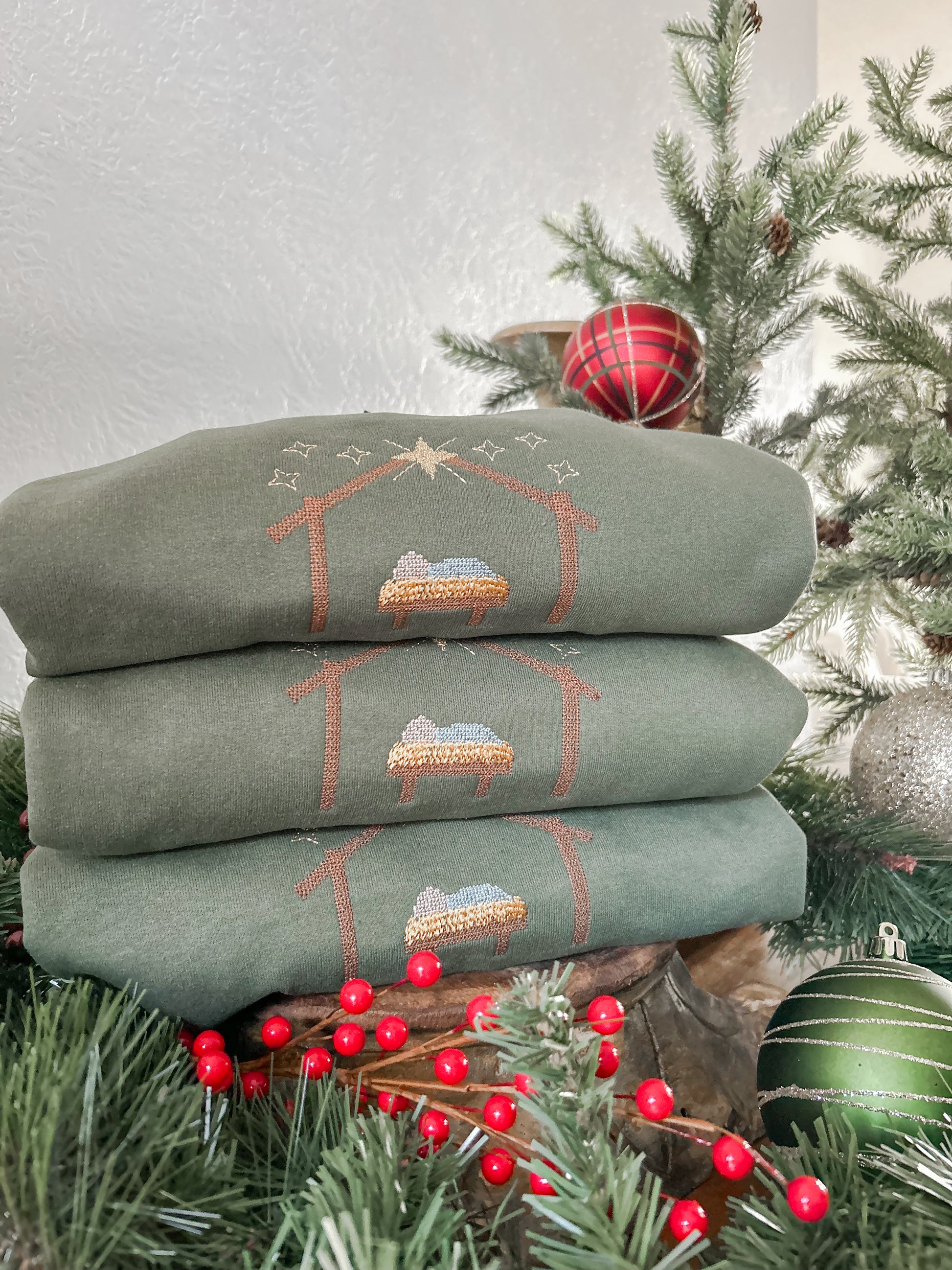 Experience the warmth of both fabric and faith with this meaningful army green sweatshirt, featuring a lovingly embroidered cross stitch manger scene. Crafted with intention, this piece honors the sacred story at the heart of the season while celebrating the beauty of handmade artistry. The soft, quality construction wraps you in comfort, while the intricate needlework serves as a daily reminder of hope and connection. A garment that supports your values and invites others to pause and reflect.