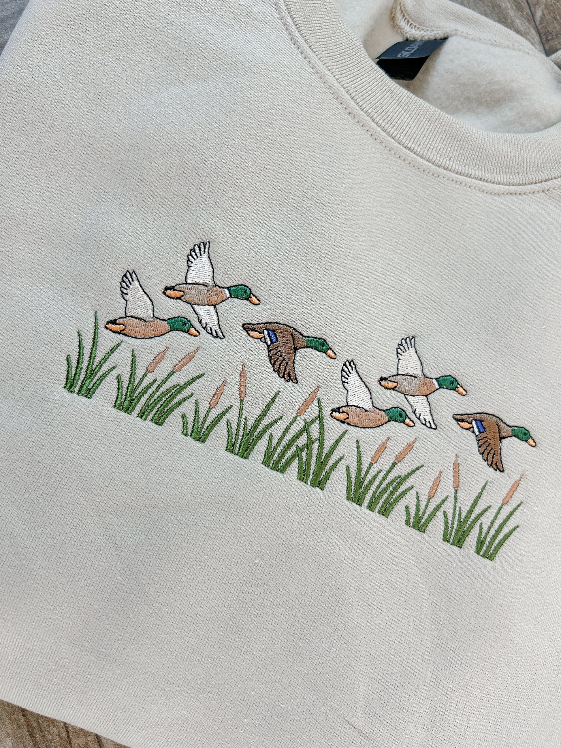 Meet your new favorite layer, the Flying Mallards sweatshirt in warm tan. This delightful pullover features an embroidered scene of mallards launching into the sky, bringing a touch of outdoor adventure to your everyday look. The detailed needlework captures the spirit of flight and freedom, while the soft, comfortable fabric keeps you cozy all day long. Perfect for duck enthusiasts, nature lovers, and anyone who appreciates a little whimsy in their wardrobe.