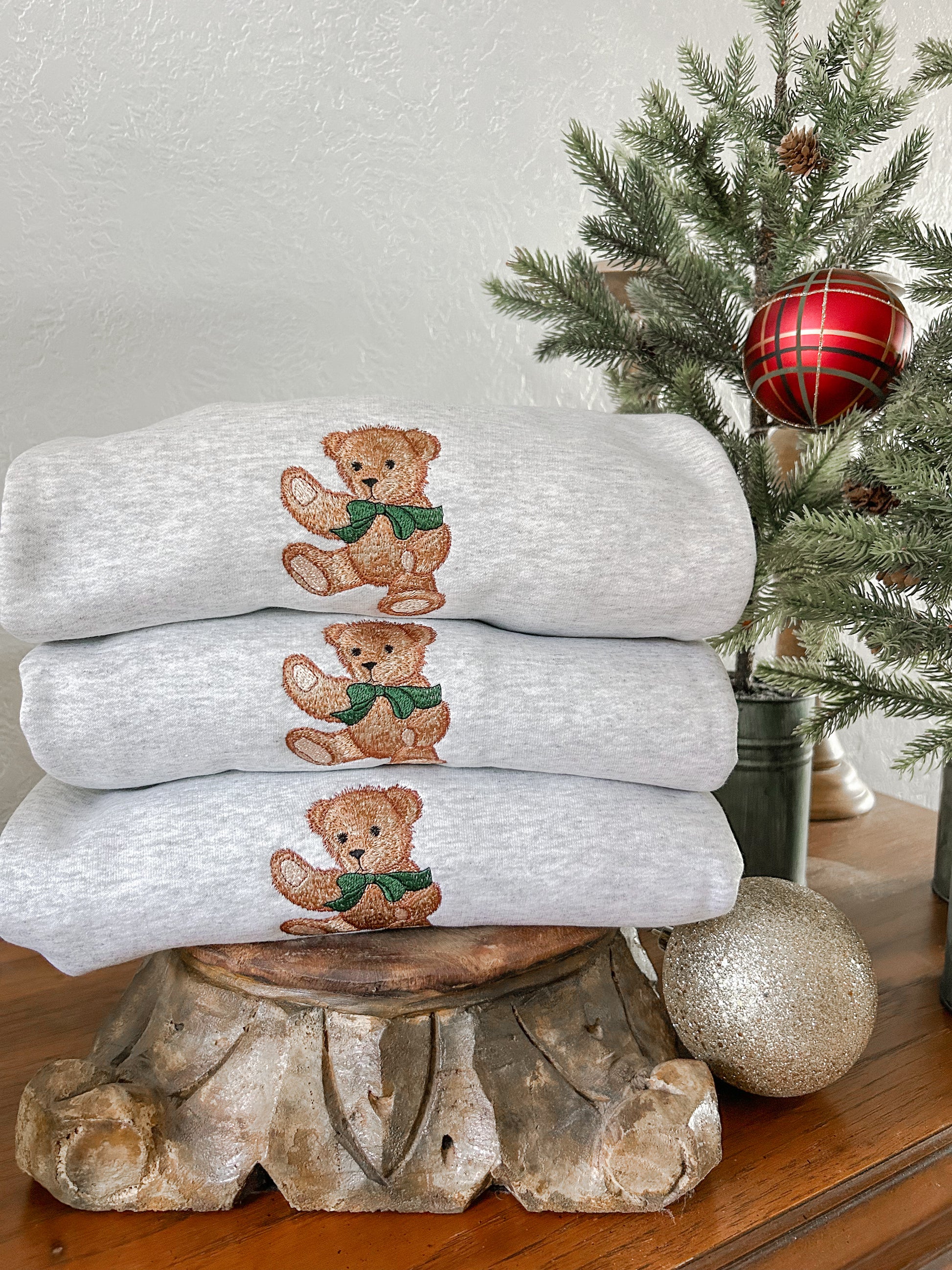 Introducing our charming Green Bow Bear sweatshirt—a cozy essential that brings warmth and personality to your everyday wardrobe. Featuring an adorable embroidered bear sporting a cheerful green bow, this ash grey pullover offers the perfect blend of comfort and whimsy. The soft, quality fabric makes it ideal for layering through cooler months, while the sweet bear design adds a touch of playful charm that celebrates your unique style. Whether you're relaxing at home or heading out for casual adventures, this sweatshirt wraps you in comfort while expressing your love for all things endearing and fun.