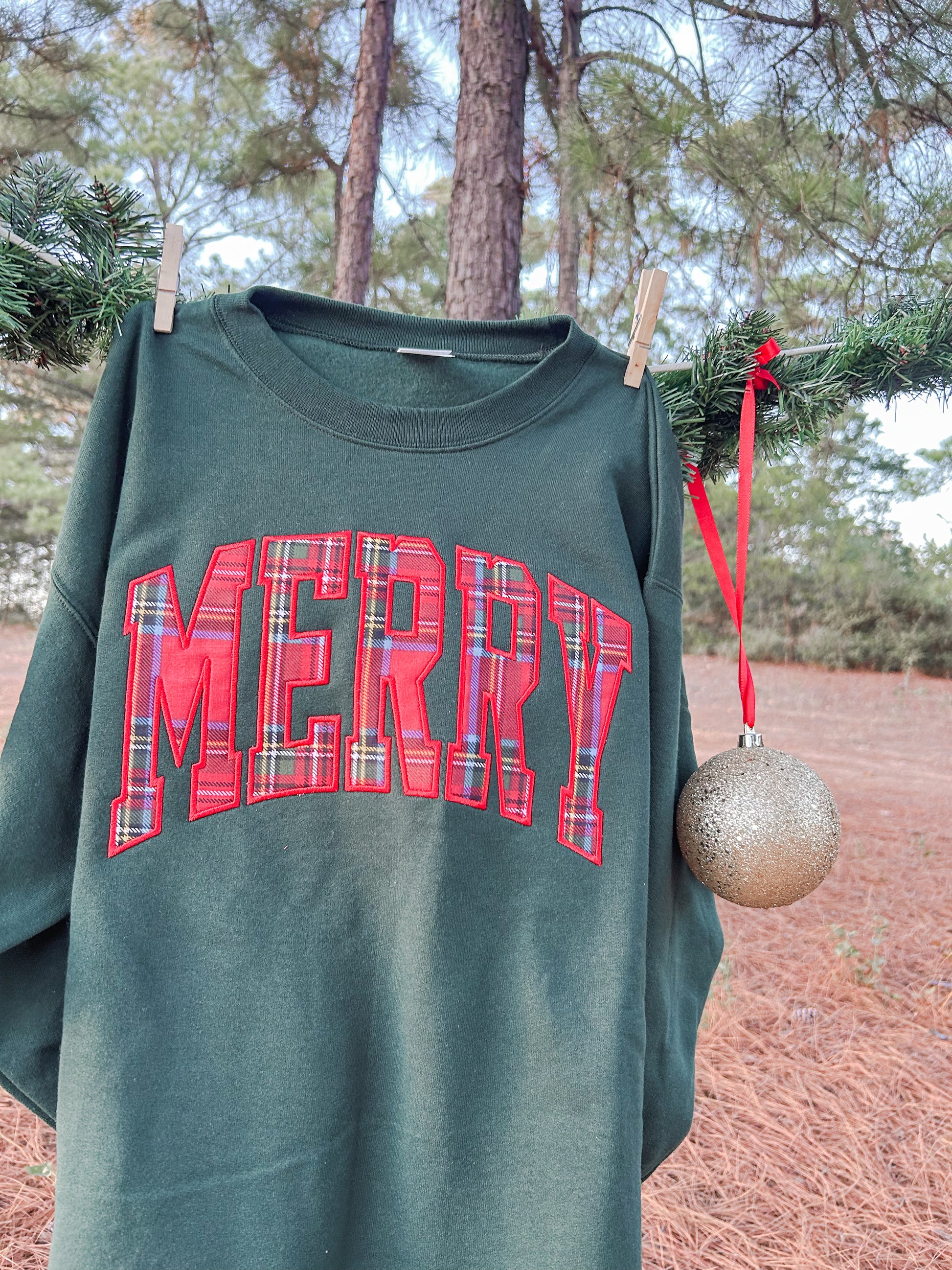 The Merry Applique Embroidered Sweatshirt in green brings festive charm with its bold "Merry" design accented by Christmas plaid. Soft and comfortable, it’s a perfect way to share holiday joy while staying warm and stylish.