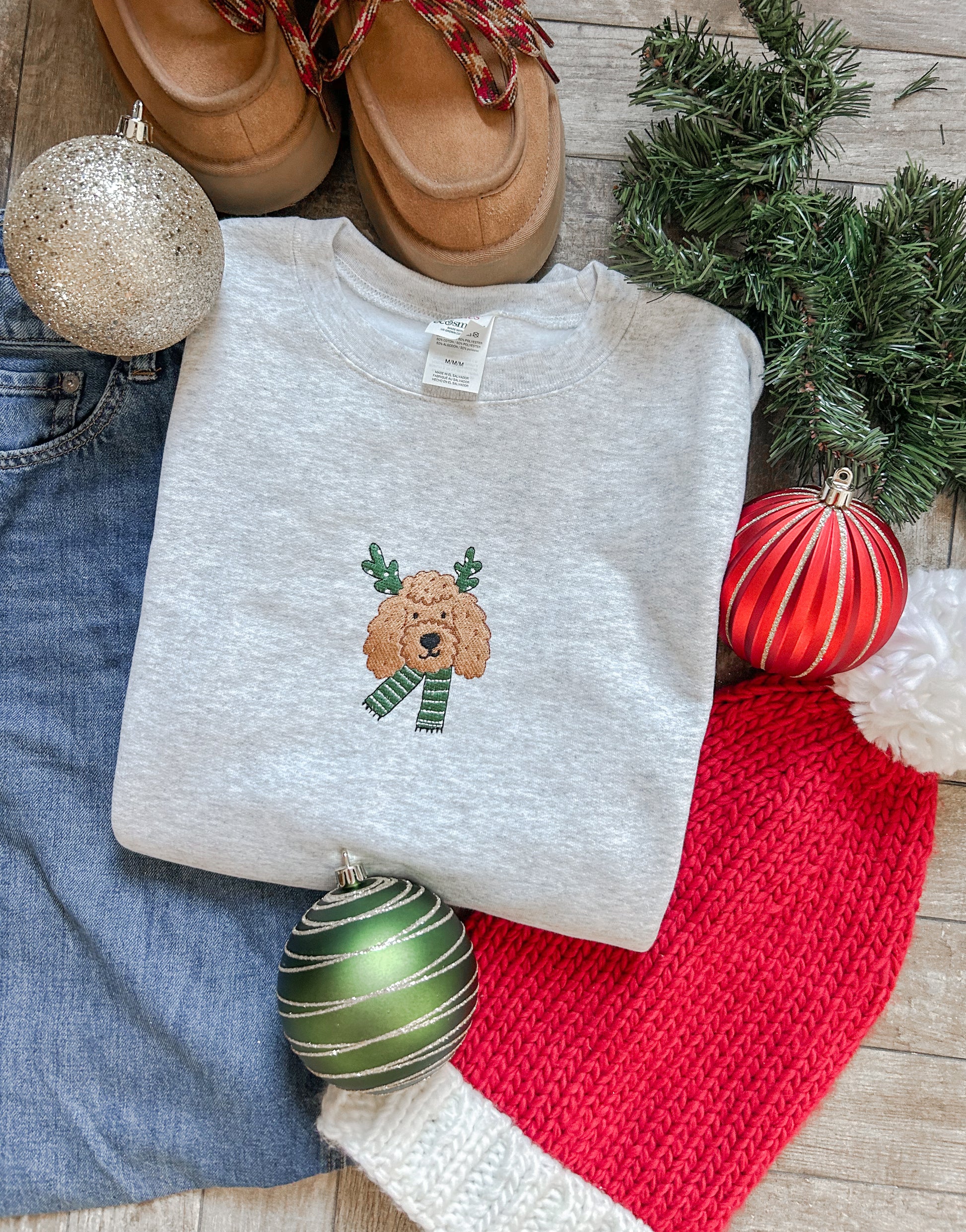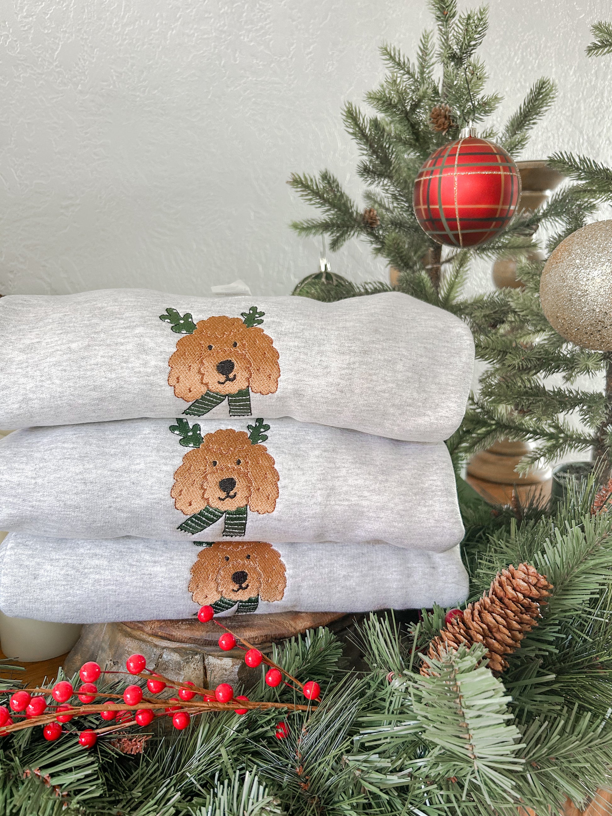 Celebrate the season with the "Oh Deer, It's a Doodle!" sweatshirt. Featuring an embroidered goldendoodle wearing festive reindeer antlers, this cozy sweatshirt brings holiday cheer and a touch of playful charm to your wardrobe.