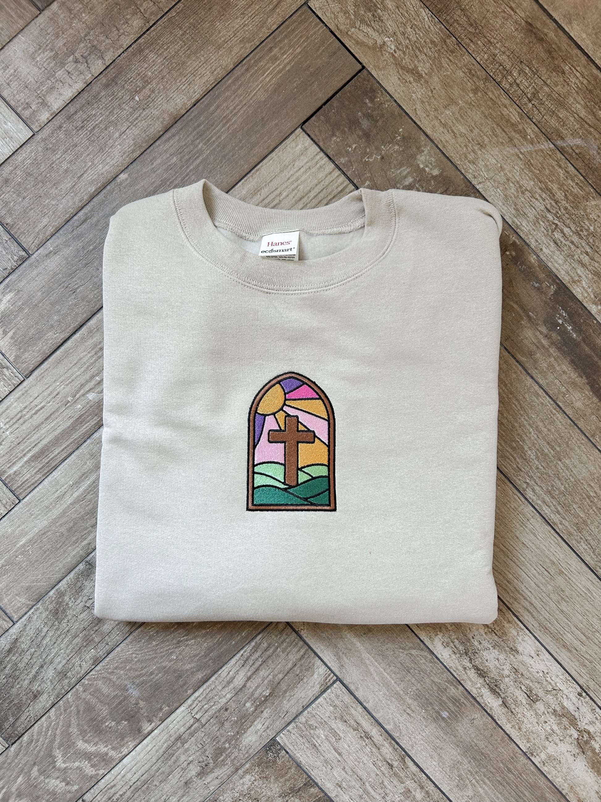 Wrap yourself in cozy comfort with this tan sweatshirt, featuring an intricate embroidered church stained glass window design. The detailed needlework captures the timeless beauty of traditional ecclesiastical stained glass artistry, creating a striking focal point that blends spiritual aesthetics with everyday wearability. Perfect for those who appreciate craftsmanship, meaningful design, and distinctive style, this piece works beautifully as a standalone statement or layered with your favorite pieces. Soft, versatile, and thoughtfully designed.