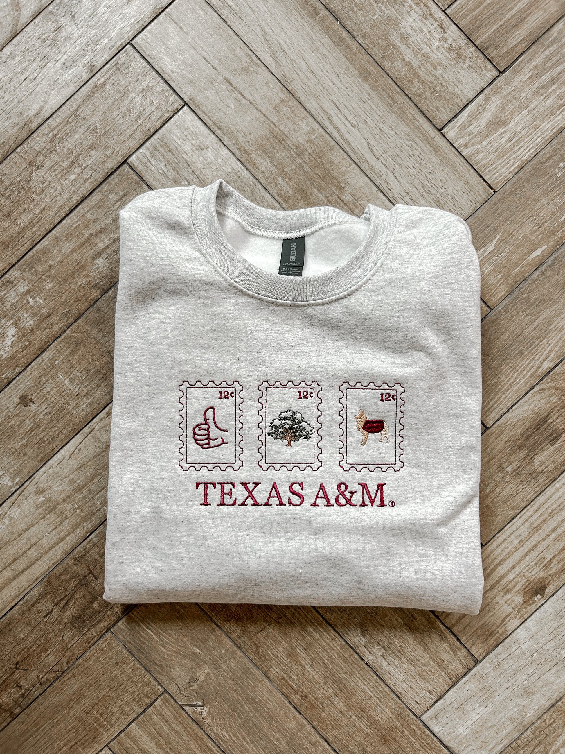 The TAMU Stamps sweatshirt features embroidered designs resembling postage stamps with beloved Texas A&M icons like the Gig’em thumb, Century Tree, and Reveille. This cozy sweatshirt offers a stylish way to show your Aggie spirit while honoring cherished traditions. Ideal for any fan who wants to wear their pride with comfort and heart.