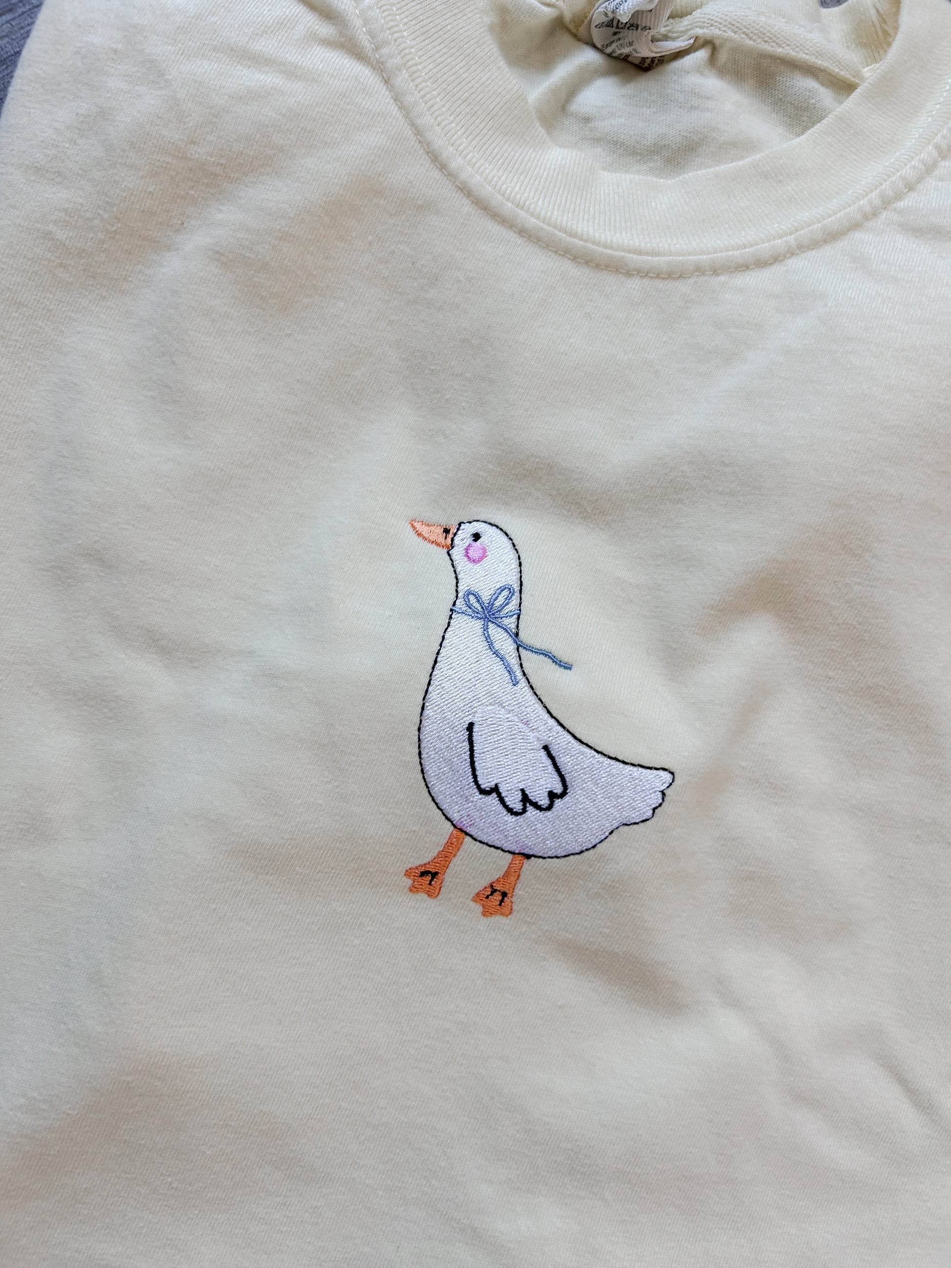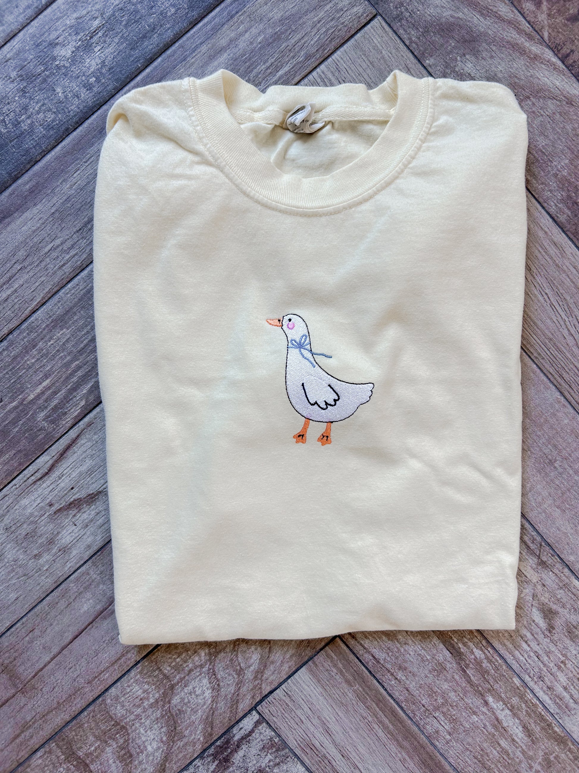 Meet your new favorite everyday tee! The Sweet Goose Tee features the sweetest embroidered goose, finished with a delicate blue bow for a charming, playful touch. Stitched on a soft banana-colored cropped tee, this piece brings the perfect pop of sunshine to your wardrobe.