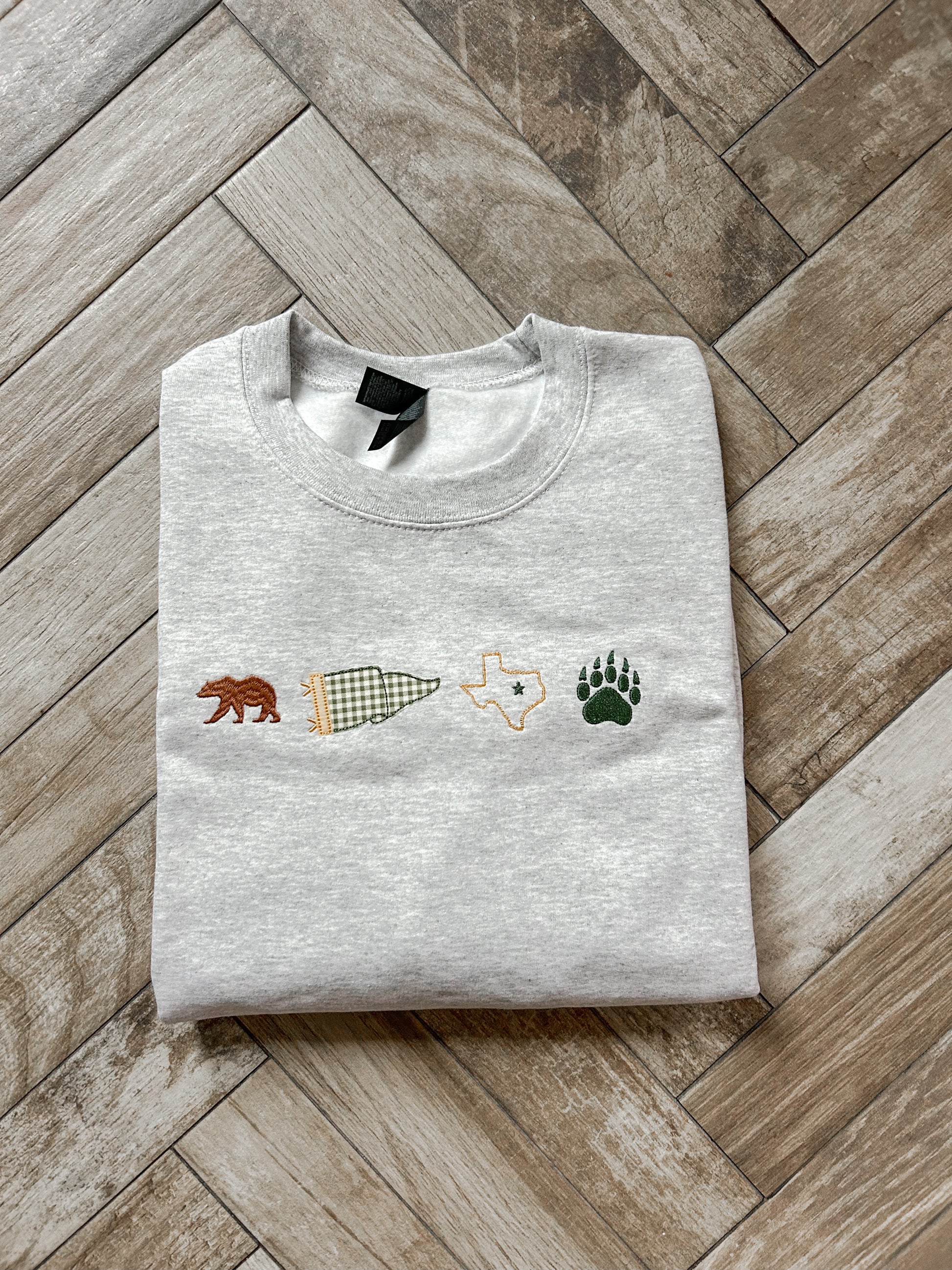 Celebrate Waco pride with this cozy embroidered sweatshirt showcasing iconic local symbols. The design features a green pennant, bear outline, bear paw, and Texas silhouette—perfect for showing your connection to the community. Soft, comfortable, and distinctly Waco, this sweatshirt is ideal for everyday wear or as a meaningful gift for fellow locals and visitors alike.